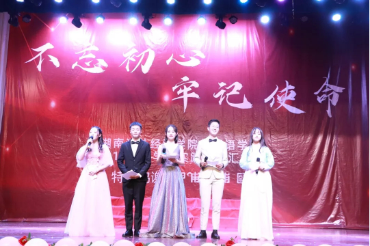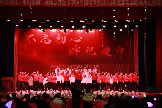 开场舞《我们都是追梦人》用青春的步伐和高涨的热情展现出新时代追梦人的风采。活动在外院李向明书记宣读表彰声中拉开帷幕。开展“不忘初心、牢记使命”主题教育,是党的十九大做出的重大部署。在此背景下,我院将“初心”和 “使命”融入到教育教学的全过程,努力培养有担当、有理想,有责任的时代新人,在班团建设、学风建设、社会实践等方面取得了不俗的成绩。在学科竞赛中,我院学子获得省级及以上的奖项达70余项,包括全国商务英语实践大赛三等奖、湖南省英语、日语演讲比赛二、三等奖和华中地区韩语演讲比赛三等奖,国家级大学生创新项目立项三项,2019届学生有30余人考上研究生。这些成绩的取得离不开学校各级领导的大力支持,也更是全院师生员工努力的结果。