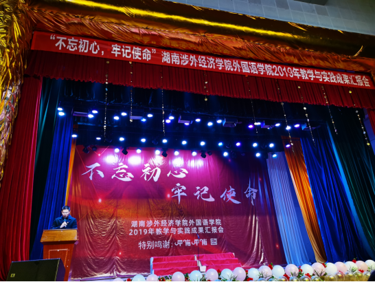 为了充分展示外国语学院教学与实践成果,突出外院学子的个人魅力,外国语学院在体育馆隆重举行2019年“不忘初心、牢记使命”之教学与实践成果汇报会。出席本次活动的领导嘉宾有副校长鞠晨曦、党委委员宣传部部长蒋艳娟、学工处处长邝继红、学工处副处长谢培山、团委书记戴薇、国际教育学院院长陈善敏、外国语学院院长姚佩芝、外国语学院党总支书记李向明、外国语学院团总支书记薛勇、外院全体辅导员和各系部主任,各二级学院学生会分会主席也都参加了此次活动。