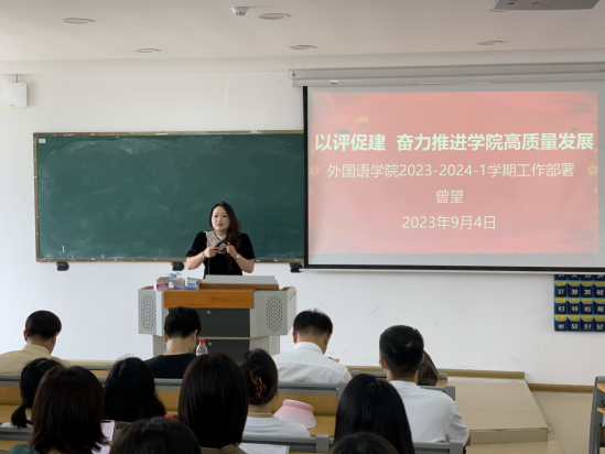 曾院长讲话的主题是“迎评促建、奋力推进学院高质量发展”,她从“狠抓教学常规,提升教学质量”、“践行三全育人、提升学生素质”、“加强队伍建设,提升教师素养”、“推进教学创新,提升成果产出”、“强化服务保障,提升幸福感受”、“拓展宣传渠道,提升学院影响”六个角度对新学期工作重点进行了部署。