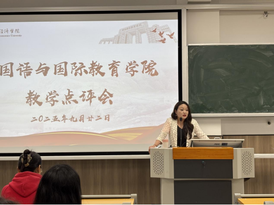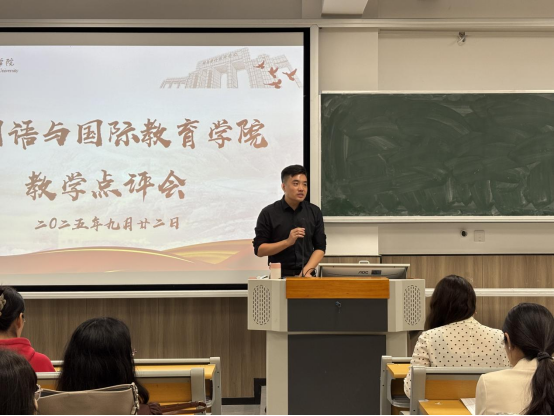 院长许二鹏总结发言,他首先对近期出现的教学事故和课堂纪律问题提出严肃批评,强调教师应恪守职业规范,提升师德师风素养。在学科竞赛方面,许院长特别指出,指导教师不应“只挂名、不参与”,而应全程陪伴和指导学生,与学生共同备战、共同成长。他鼓励教师们积极投入竞赛指导工作,勇于迈出第一步,实现教学相长。许院长表示,学院将持续推进人文关怀建设,努力营造如“家”一般温暖、安心的工作氛围,广泛听取并合理采纳教师意见,支持每一位教师在职业发展和个人生活方面实现更好的平衡。他希望全院上下团结一心,共同推动外国语与国际教育学院迈向更高质量的发展。
