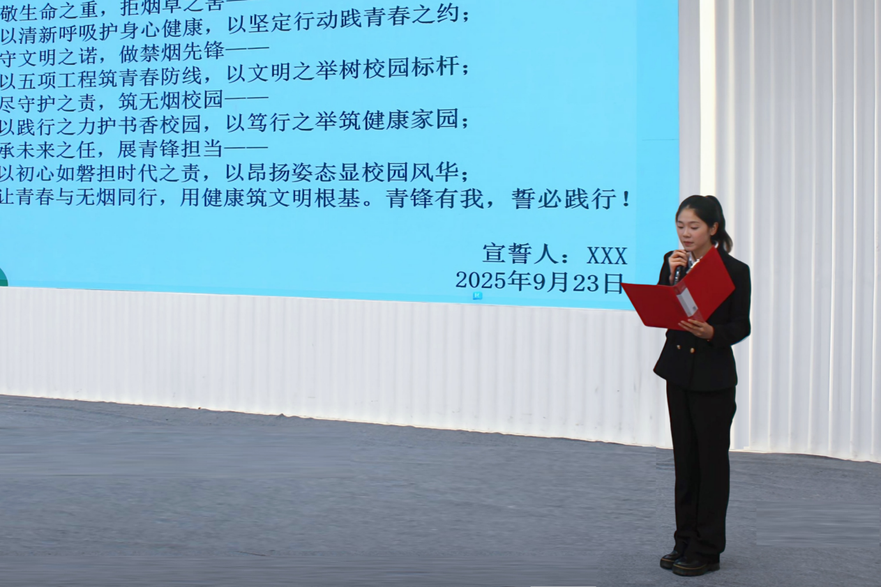 现场,新生代表张微作“不主动吸烟、不接受递烟、不纵容吸烟、积极劝阻吸烟”的“四不”承诺;学生干部代表张栩睿倡议同学争当“校园禁烟劝导员”,承诺干部率先垂范。随后,青锋团干部王琼带领全体参会人员宣誓,誓言彰显师生禁烟决心。
