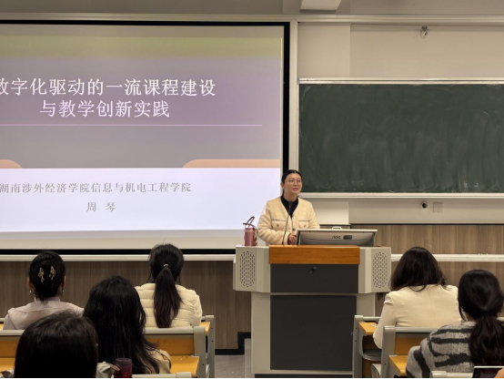 11月12日下午,外国语与国际教育学院在第五教学楼106教室举办“跨语融教”大讲堂第七期活动。活动特邀湖南省芙蓉教学名师周琴教授作“数字化驱动的一流课程建设与教学创新实践”专题分享,学院全体教职工参与,副院长曾望主持。