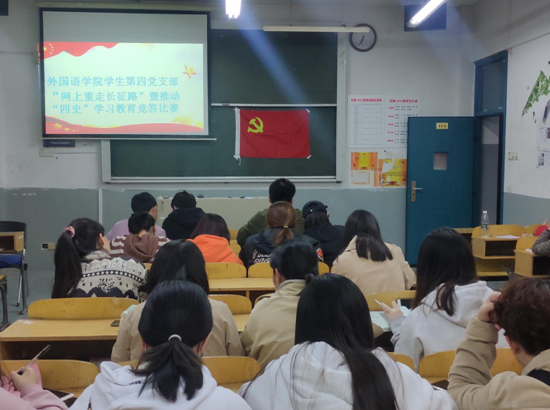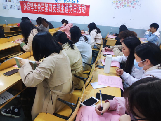 11月23日晚六点,外国语学院学生党员第四党支部在五教401教室开展以“学习五中全会精神,争做新时代合格党员”为主题的11月份主题党日活动。活动由外国语学院第四党支部书记朱双同志主持,第四党支部全体在校生党员、预备党员参加了本次活动。