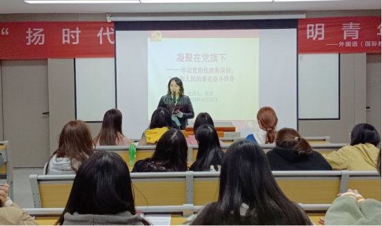 2024年10月22日晚,外国语与国际教育学院第52期入党积极分子培训班在世纪讲坛三教室开展党课学习,本此党课的主题为“学习光辉党史,沿着中国特色社会主义道路前进”和“牢记党的性质和宗旨,为党和人民的事业奋斗终身”。分别由我院商务英语第二支部书记王敬双和英语第五支部书记张蓉授课。