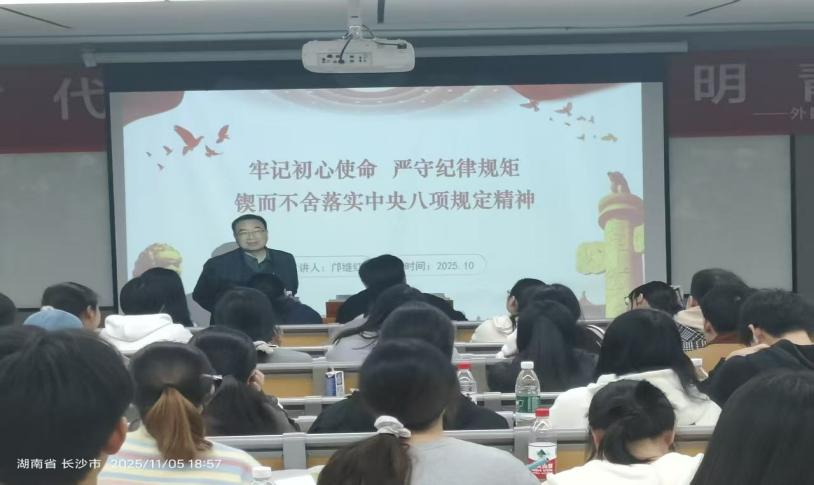 为持续深化学院党风廉政建设,从思想源头拧紧党员干部 “廉洁开关”,切实筑牢拒腐防变思想防线,2025 年 11 月 5 日晚七点,外国语与国际教育学院在世纪讲堂 3 号教室开展 “牢记初心使命,严守纪律规矩” 专题党课。本次党课特邀校党委组织部部长邝继红以 “锲而不舍落实中央八项规定精神” 为题作专题宣讲,学院全体党员干部及相关学员全程参与学习。