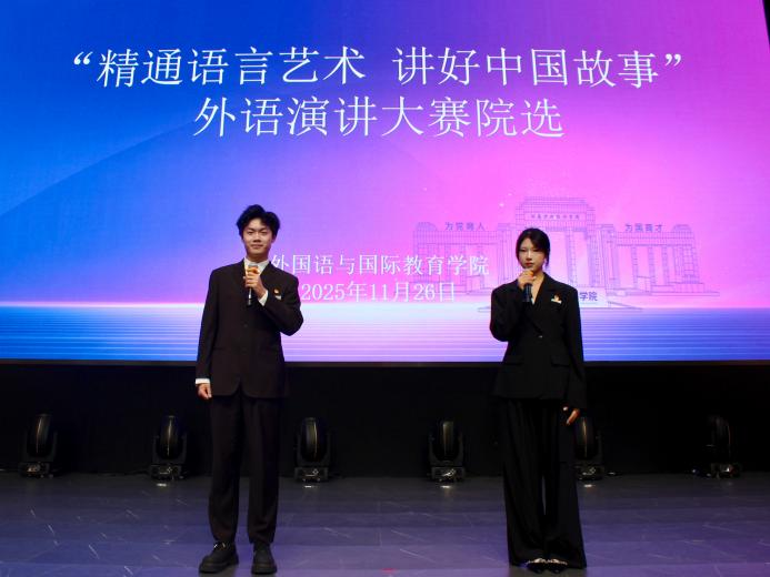为提升外院学子外语应用能力、助力文化传播,第二届“精通语言艺术,讲好中国故事”外语演讲大赛于2025年11月26日晚在世纪讲坛顺利举行。外国语与国际教育学院党总支书记、执行院长许二鹏,副院长曾望,党总支副书记匡希茜,团总支书记赵晗宇及各辅导员老师出席本次赛事。