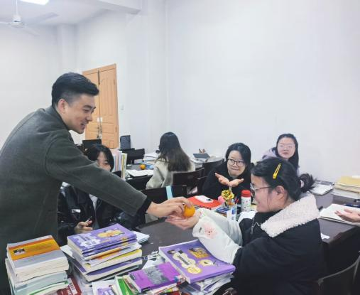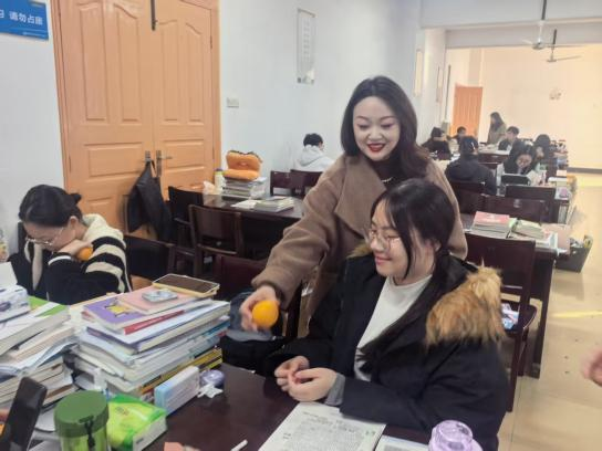 慰问现场暖意融融。学院领导们将精心准备的橙子逐一送到学子手中,每一颗金黄饱满的橙子上,都亲手书写着“上岸”“稳了”“前程似锦”“马到成功” 等简短真挚的祝福语 —— 橙子寓意 “心想事成”“旗开得胜”,手写的期许更凝聚着学院对学子的深厚关怀。这份别出心裁的礼物,既为埋头苦读的学子补充了能量,更送上了精神上的巨大鼓舞,让备考的疲惫在暖意中悄然消散。