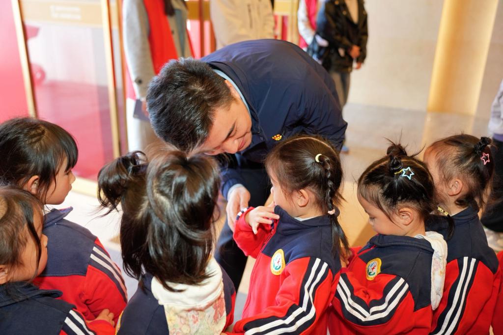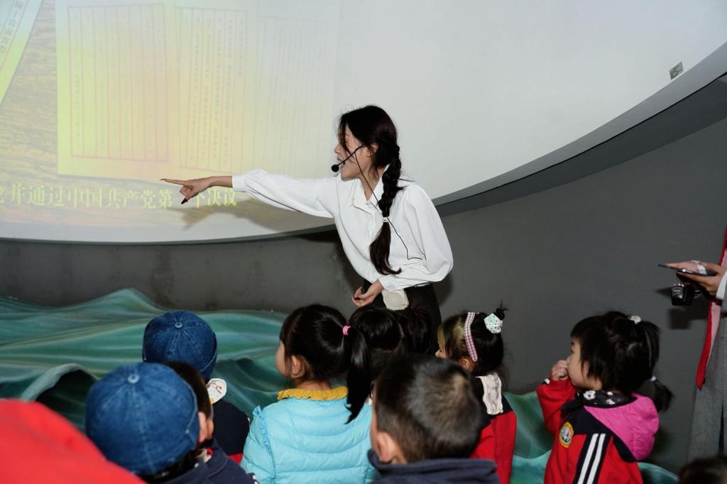 参观过程中,馆内讲解员结合幼儿年龄特点与认知规律,用生动浅显、富有童趣的语言,带领孩子们回顾党的光辉历程。通过讲解馆内历史图文与实物展品,讲述红色革命故事,让孩子们在沉浸式体验中感受红色文化,体悟革命先辈的爱国精神。