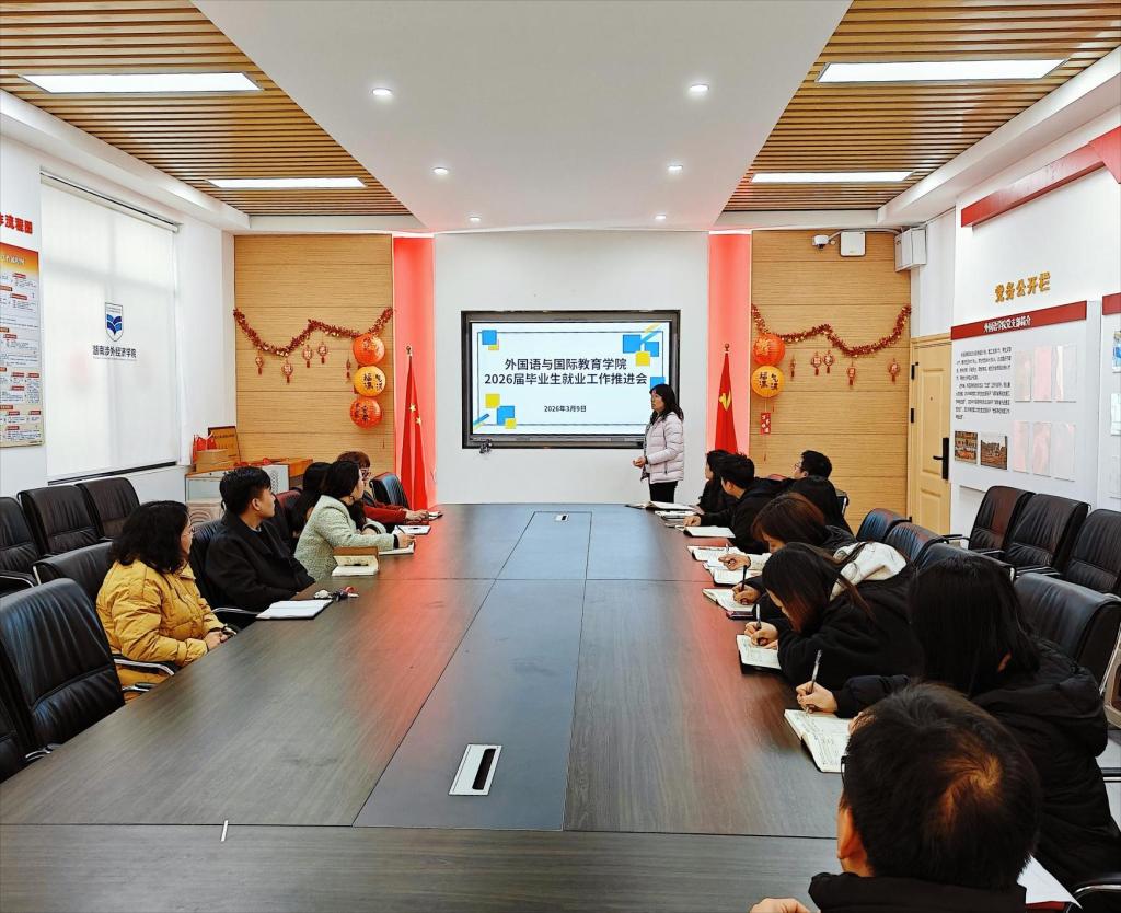 为深入落实学校就业工作整体部署,全力推动 2026 届毕业生实现更高质量和更充分就业,3 月 9 日下午,外国语与国际教育学院召开 2026 届毕业生就业工作推进会。学院执行院长许二鹏、副院长曾望、党总支副书记匡希茜,各系部主任、年级长及毕业班辅导员参会。会议由匡希茜副书记主持。