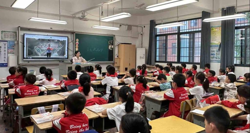 “教室里会发光、能写字的智能黑板,像不像一本为大家打开知识大门的会动绘本?”“用手机和远方的爸爸视频,随时分享校园趣事,这背后藏着怎样的‘中国智慧’?”。“青锋团”双语宣讲队成员刘思琪以“寻找生活里的小惊喜”为切入点,用孩子们熟悉的校园场景与日常体验拉近距离。亲切的提问瞬间点燃现场氛围,孩子们纷纷举起小手抢答,稚嫩的声音里满是对生活科技的好奇——这场互动不仅打破了“宣讲”的距离感,更为后续爱国主义教育的展开铺垫了生动鲜活的基础。