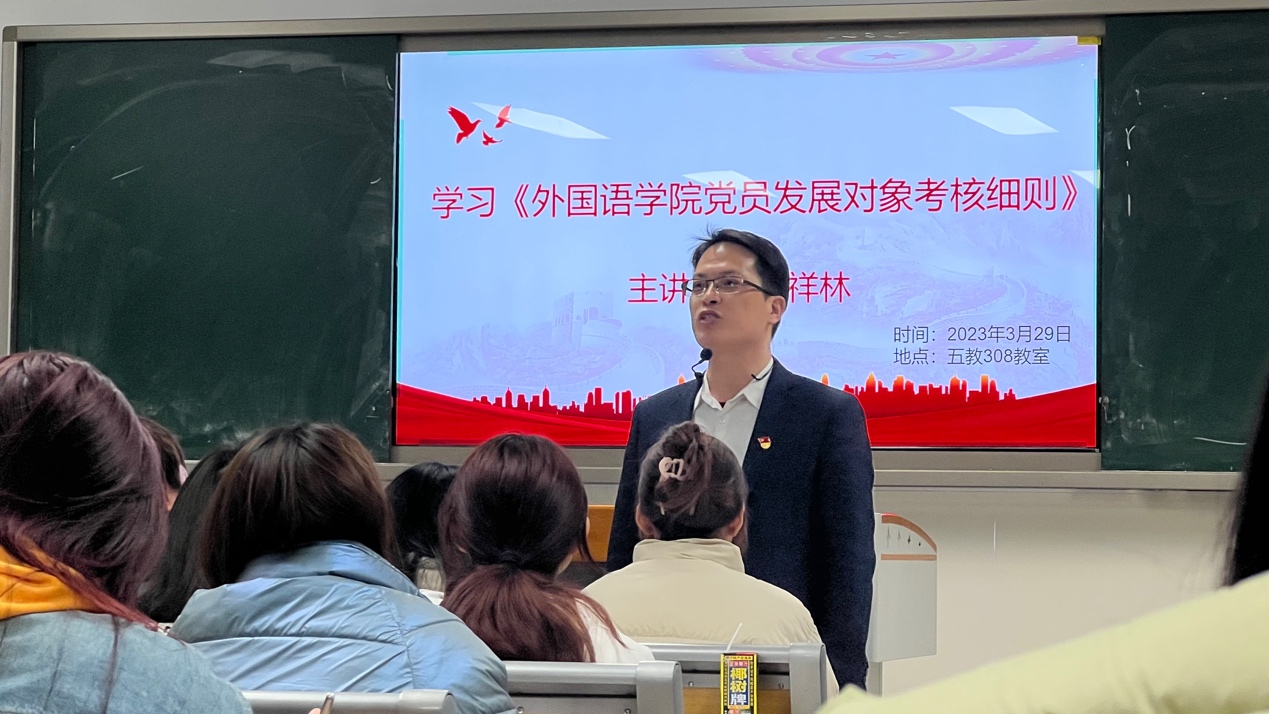 2023年3月至4月,外国语学院分党校举办了第49期入党积极分子培训班、2023年上半年发展对象培训班、2023年上半年预备党员培训班。为期一个月的培训中,具体负责培训工作的老师、学生党建办、各学生党支部勤奋工作,全体学员积极努力、认真学习,圆满地完成了培训班的各项工作任务。49期党训班的202个学员,经过考核、考试、综合测评,有177人顺利结业;预备党训班的88个学员,全部考核合格;发展对象培训班73人,53人考核合格。